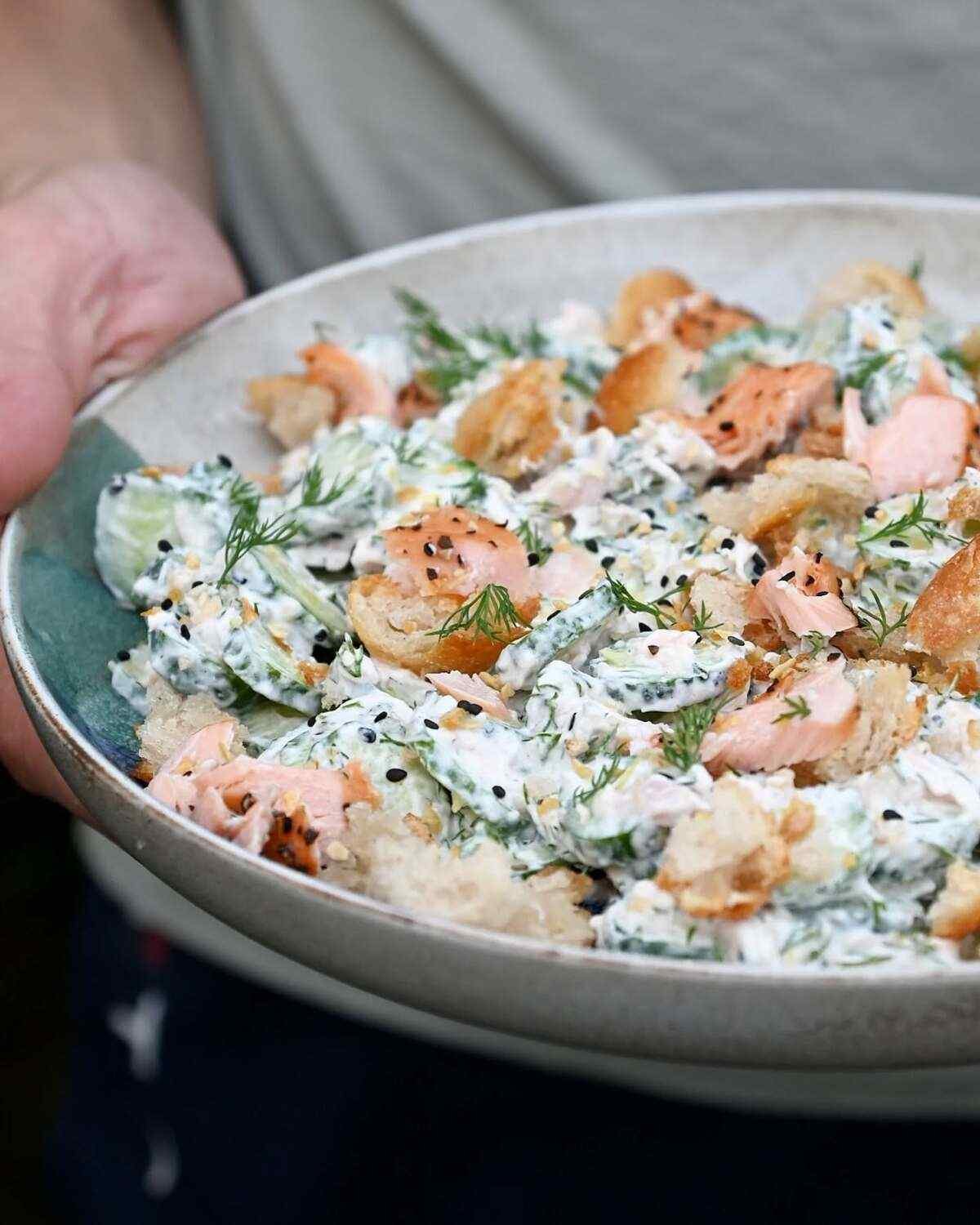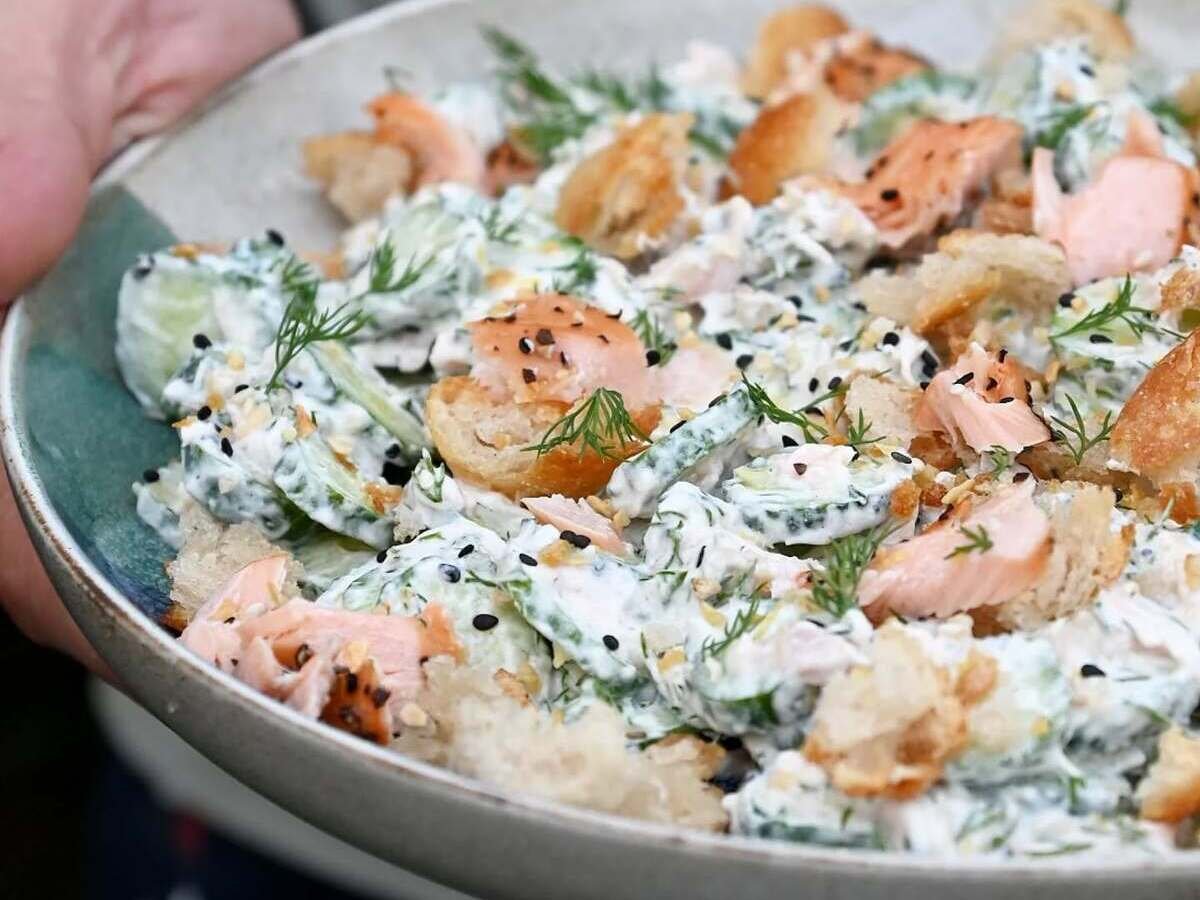 Sourdough duona suteikia traškią tekstūrą ir rūgštelės skonį, kuris puikiai dera su jogurto padažu ir lašiša. Jos tvirta struktūra išlaiko formą net sumaišyta su padažu.