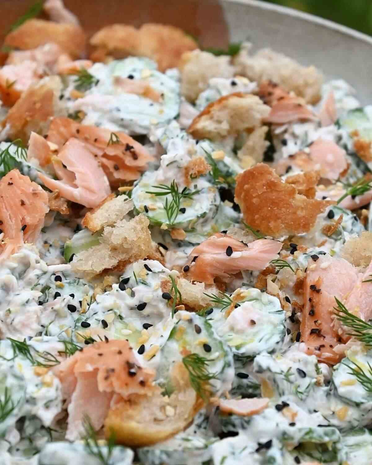 - Supjaustytus agurkus sumaišykite su paruoštu padažu, įmaišykite didžiąją dalį skrudintos duonos ir pusę žuvies. Išdėliokite ant serviravimo lėkštės, ant viršaus uždėkite likusią žuvį (suplėšytą į gabalėlius), likusią duoną. Užberkite šiek tiek juodųjų pipirų, skrudintų sezamo sėklų, papuoškite krapų šakelėmis ir patiekite iš karto. Skanaus!