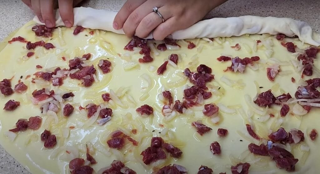- Ant tešlos dėkite mėsos gabaliukus (maltą mėsą) ir svogūną, tolygiai paskirstykite per visus 4 sluoksnius.