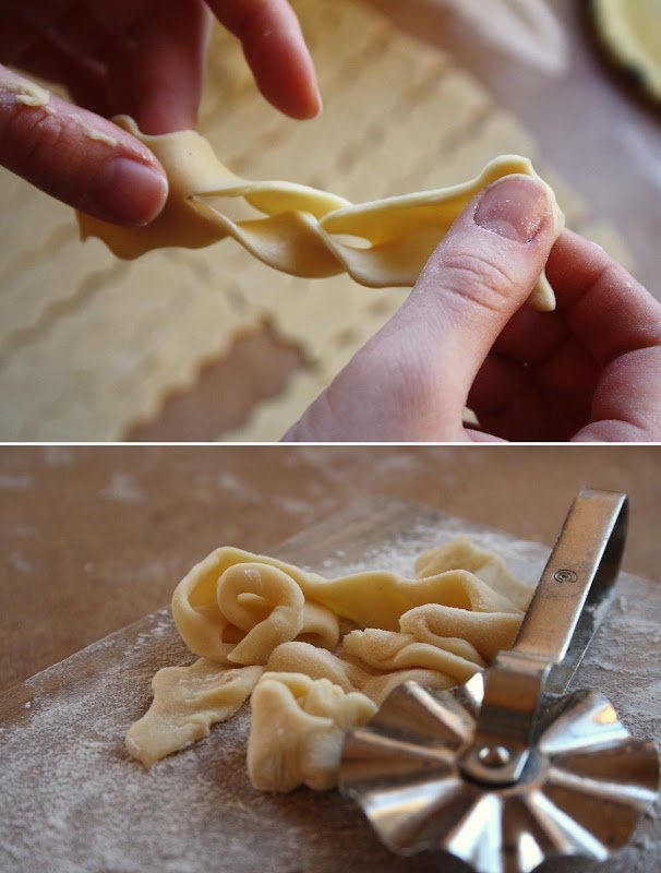 - Po valandos iškočioti tešlą kuo ploniau, supjaustyti stačiakampėliais, įpjauti per viduriuką, pernerti ir jau turime žagarėlį.