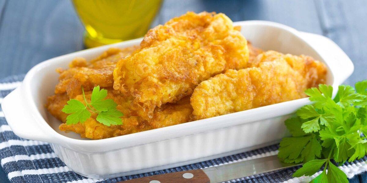 - Įkaitinkite aliejų gilioje keptuvėje ar storadugniame puode. Žuvies gabalėlius merkite į tešlą, o tada dėkite į įkaitintą aliejų. Kepkite 3–4 minutes, kol tešla taps auksinės spalvos.